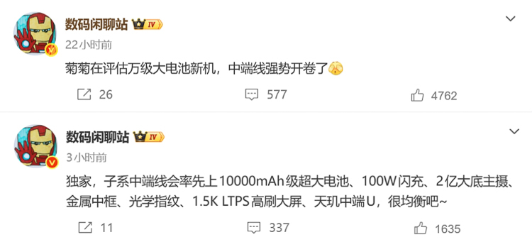 除了vivo,根据数码闲聊站的爆料,华为和小米也将推出万级大电池新机。